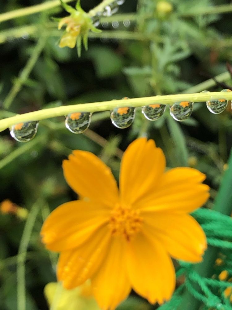 雨の晴れ間にキバナコスモスの滴が美しい。
