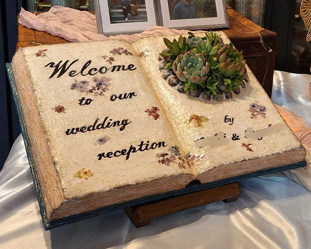 娘に頼まれて作ったウェルカムボード(ブック型多肉寄せ植え)を持っていき、会場入口近くに飾ってもらいました❕😄