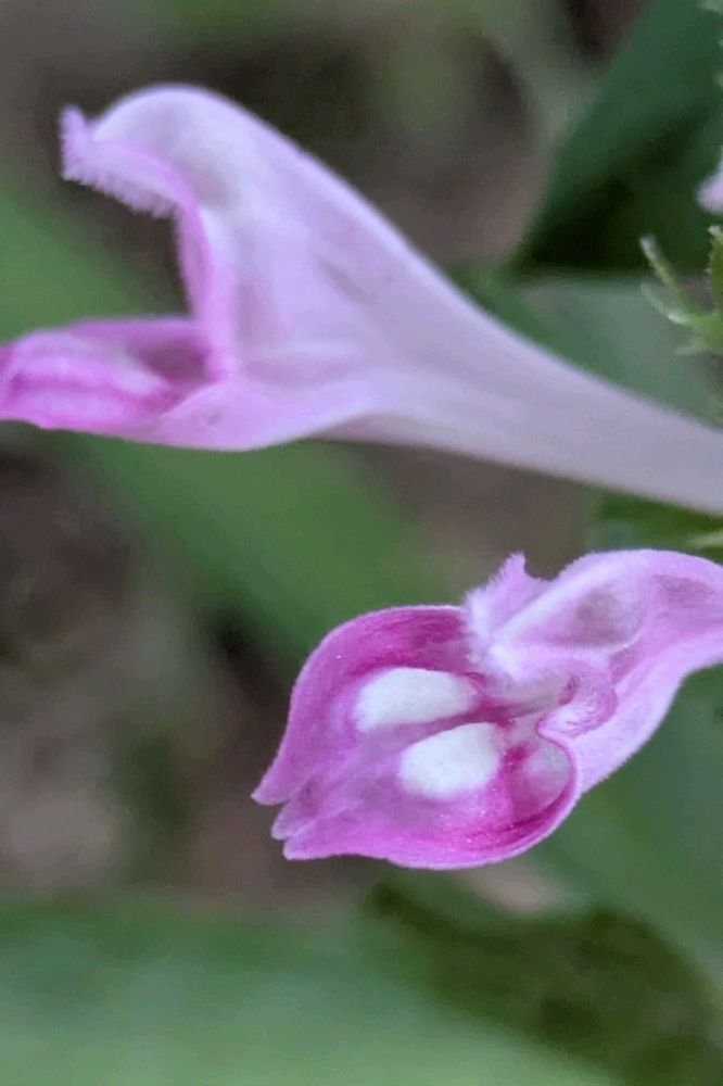 花弁をもう少し見てみると、下唇の先は3裂、上唇の内側には毛が生えていて、4個の雄しべが張り付き、白い1個の雌しべの先端が飛び出している 19日はピンクの日!🏷
