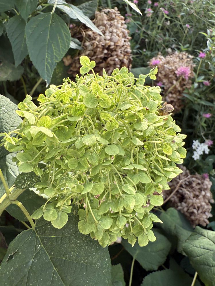 アナベルを移植しようか迷っていたら、遅くに咲いたアナベルがいた模様。一つだけみどりん。