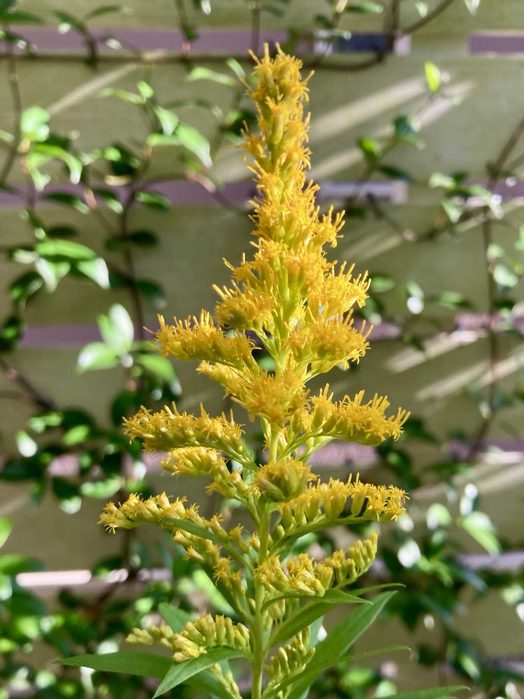 庭に何やら知らない植物が生えてきたので楽しみにしていたら、セイタカアワダチソウでした。陽の光を浴びてなかなかの美しさ。