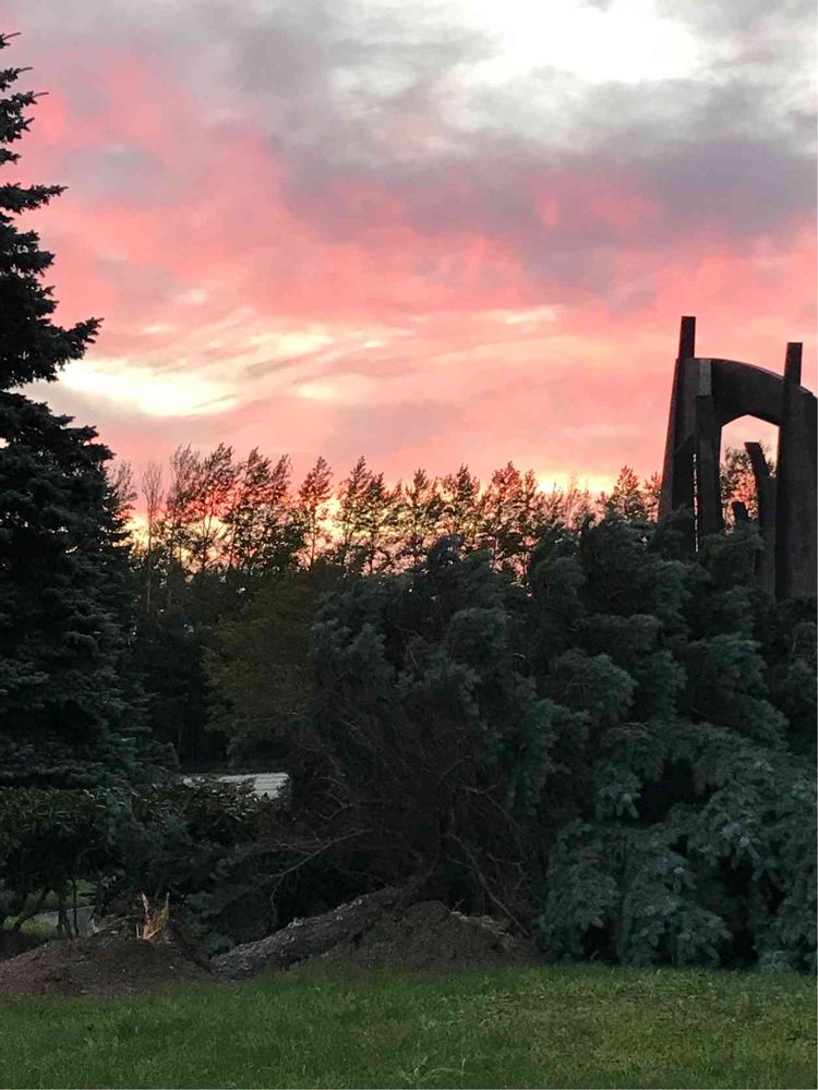 夕焼けが、たくさんの倒木を悲しんでいるように見えます。