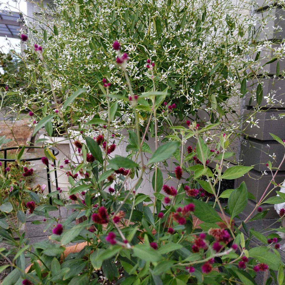 ②③ワッサワッサのユーフォルビア・ダイアモンドフロストと小さな花の千日小坊 千日小坊はセンニチコウ属ではなくてアルテラナンテラ属の多年草です😊