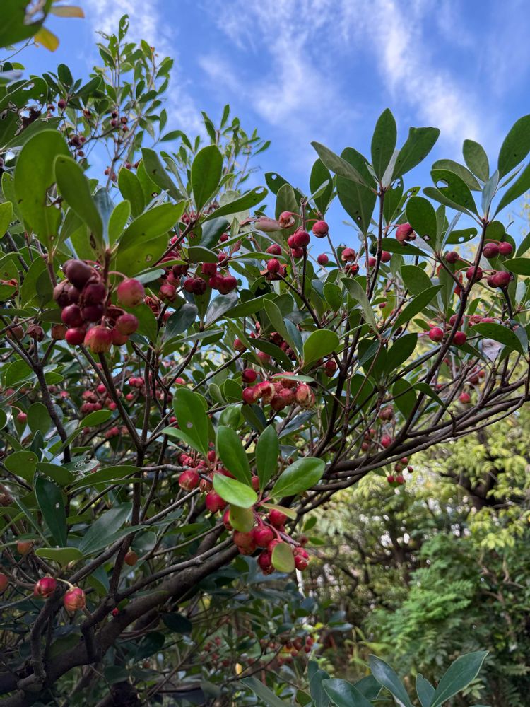 こんばんは。モッコクの赤い実と熟して破裂した椿の実。秋を感じます🍂