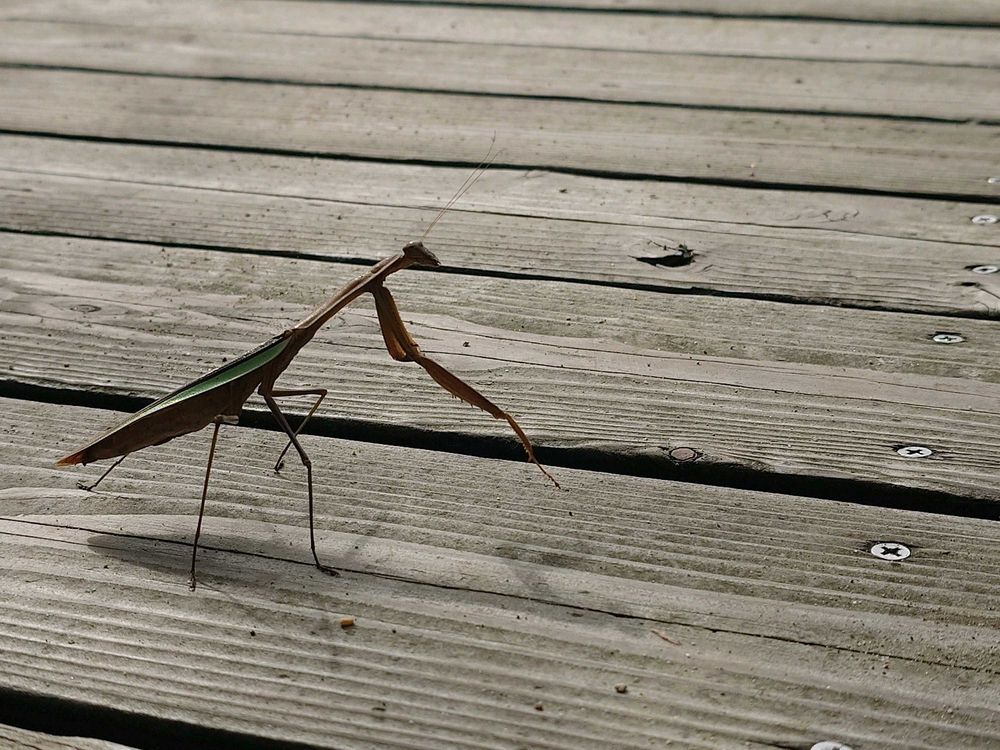 微動だにせず…帰りの車に乗り込んで見てると、犬を連れたおじいちゃんが。カマキリに気づいてない様子。犬も。
