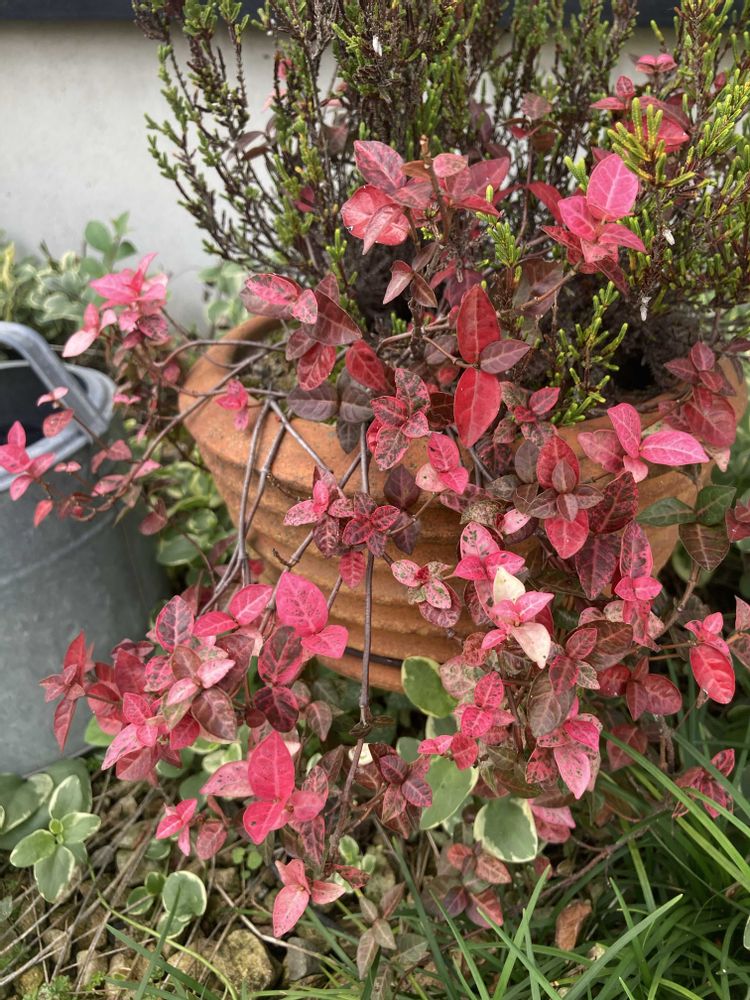 鉢植えのコキアから、垂れてきてる赤い葉っぱのハツユキカズラ😊綺麗に色ずいて素敵💕✨✨コキアが赤くなるの楽しみにしています~💕