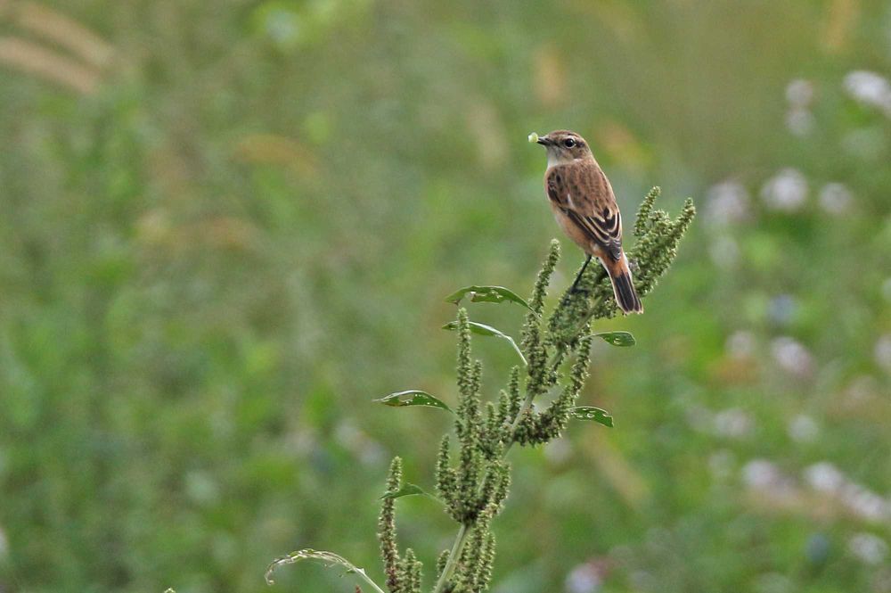 ノビタキちゃん、エサをくわえて遠くを見てますね。