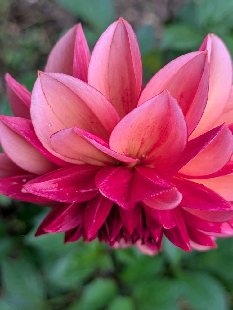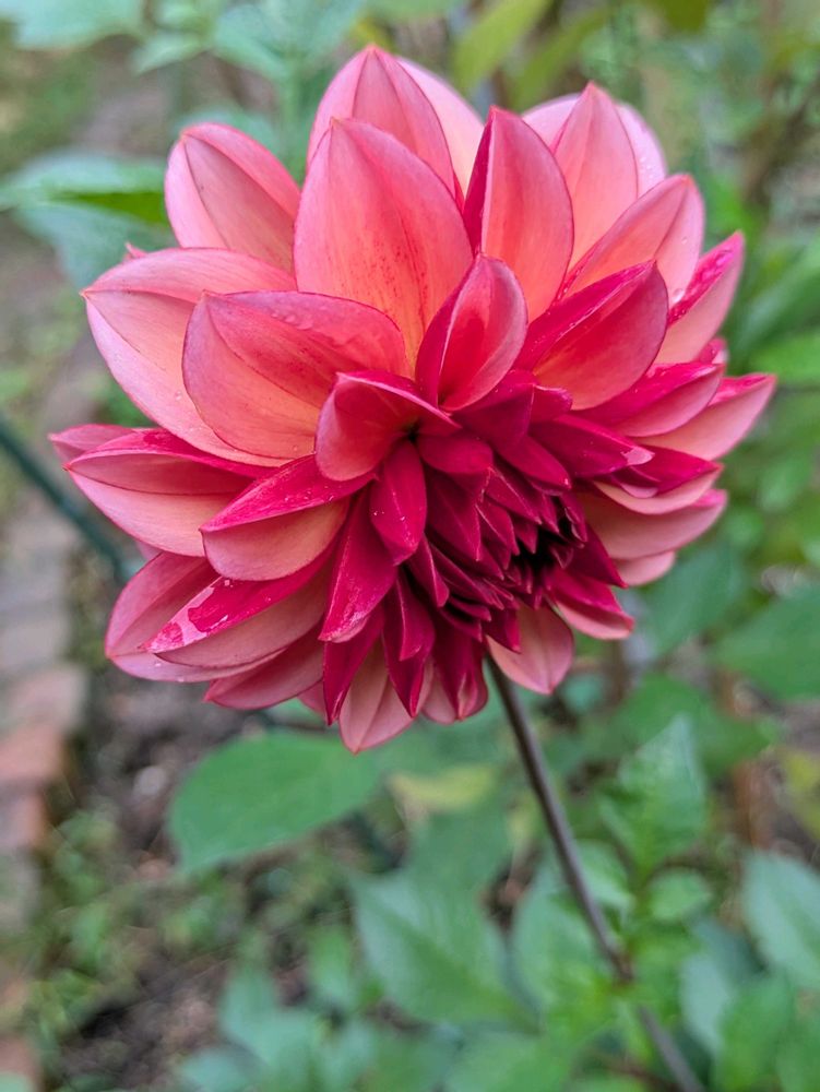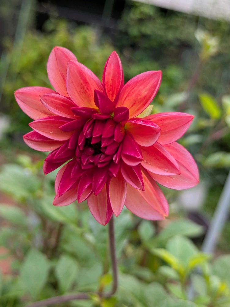 このダリアは、開きかけは真っ赤で、開いてくると裏側が赤、前は違う色で綺麗です。