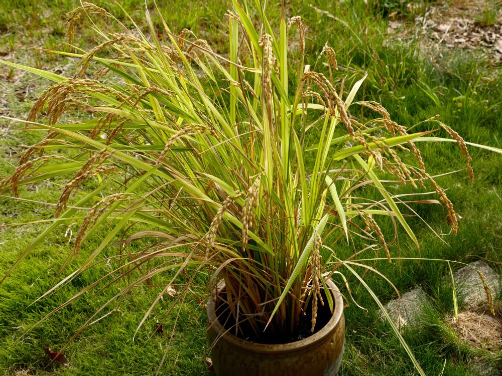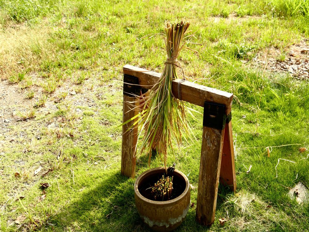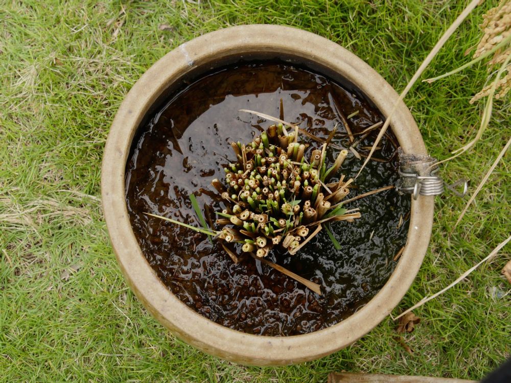 ❶❷❸バケツ(壷)稲作。5、6本の苗からこれだけ増えました。さすが、稲は強い!