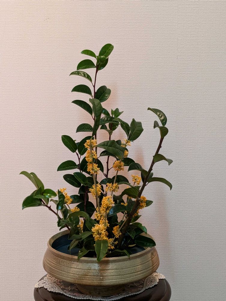 キンモクセイは立ち姿を表現できればいいのですが、長さにも数にもおそらく制限があるでしょうから、無理に花器と剣山を使うより、濃いめの花瓶長短のある枝をザクっと生けるのが似合いそうな気がします。