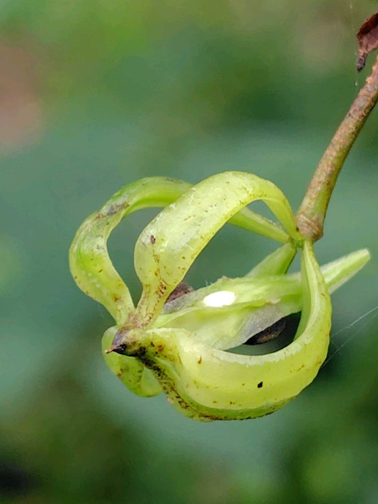 果実は長さ1〜2cmの披針形で肉質の蒴果、熟すと軽く触れただけで、パチンと音を立てて弾ける。5片に裂開し、裂片は渦巻き状に巻いて種子を飛ばす。