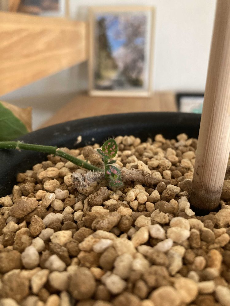 ①根元から、小さなピンクの斑入りの新芽ちゃんが出てきていました🌱