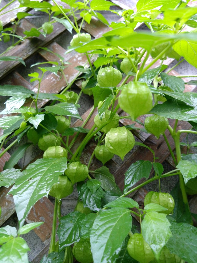 畑の厄介者らしいですがこぼれ種が溝に生えてます可愛いホオズキが出来てます