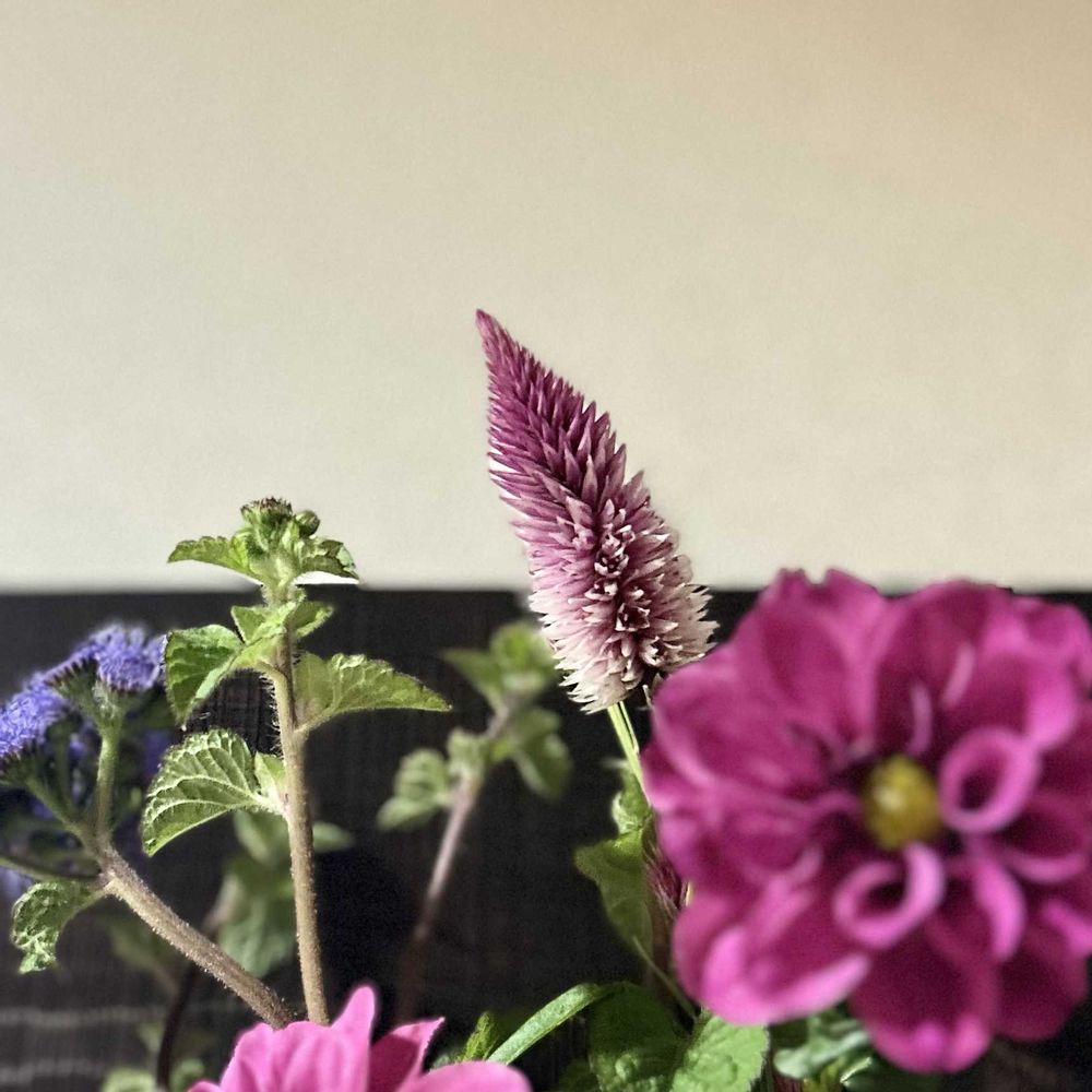 八ヶ岳にあるお花屋さんが、ダリアとセロシア、アゲラタムを使った花束を作って売っていたので、それを真似してます😊