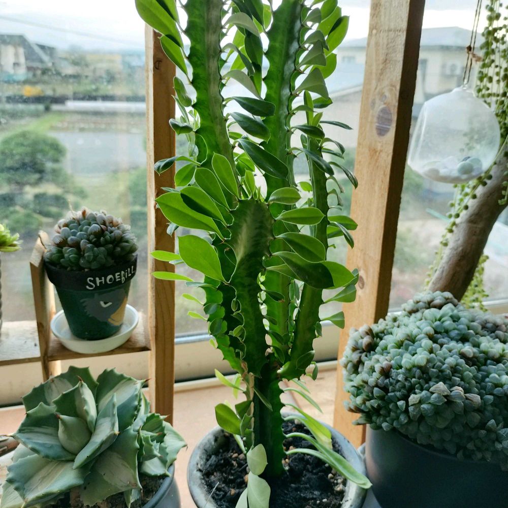 サボテンに似ていますが、ユーフォルビア属の植物であり、葉があるのが特徴です。