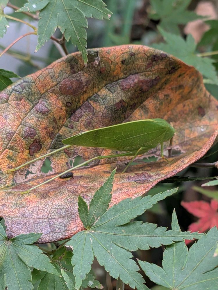 柿の落ち葉の上でツユムシの仲間が休憩中。枯れ葉の上じゃ目立ってます。