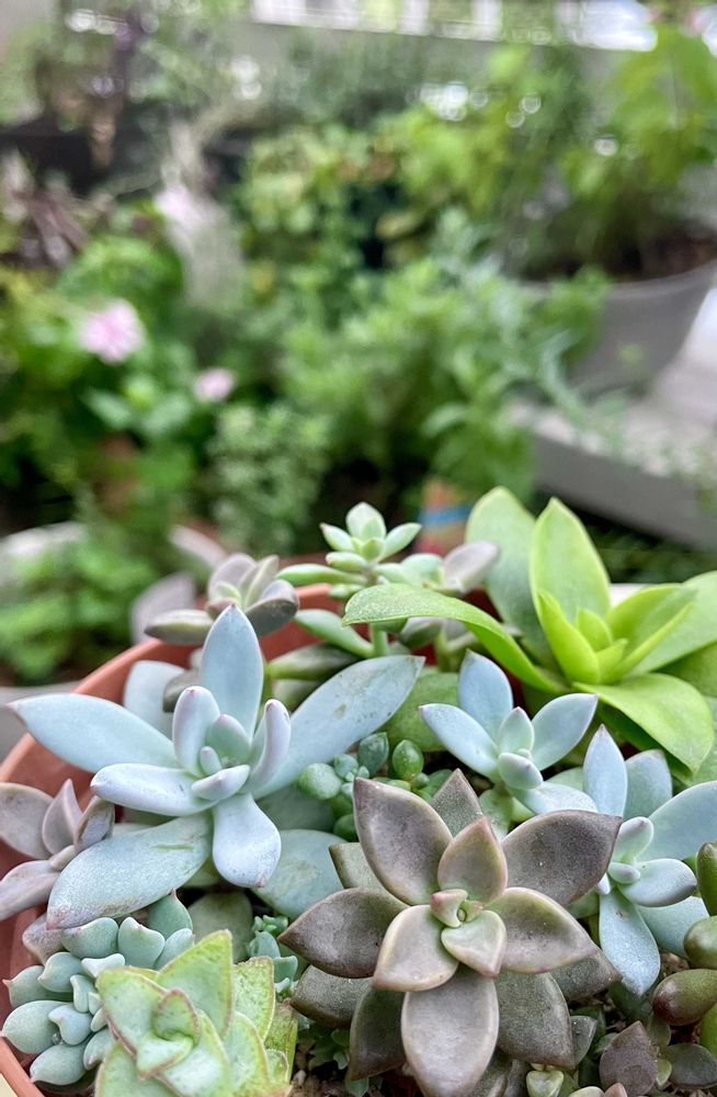 💚今日は多肉植物🪴…と肉球🐾編み物*͈ᴗ͈ˬᴗ͈ෆ 1枚目の多肉は 葉挿しから育てて夏越しして大人になってました😊……真ん中にいるブルー💙の子がめっちゃお気に入り♡♥️