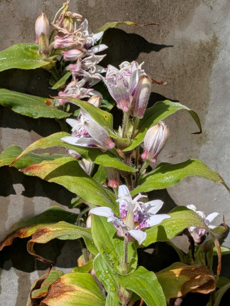 暑かった夏に少し葉が枯れ気味の…移植したばかりなので水遣りした後です。