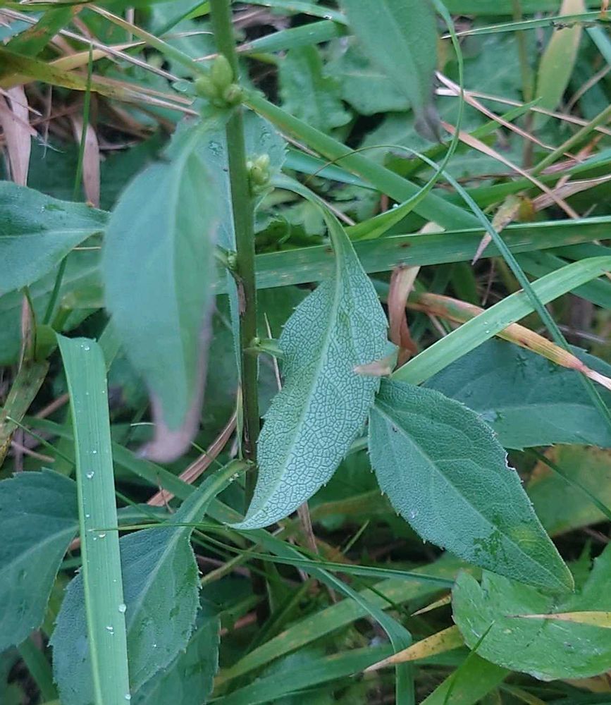 茎葉は長さ7~9cmの卵形〜卵状楕円形で、基部は柄の翼につながる