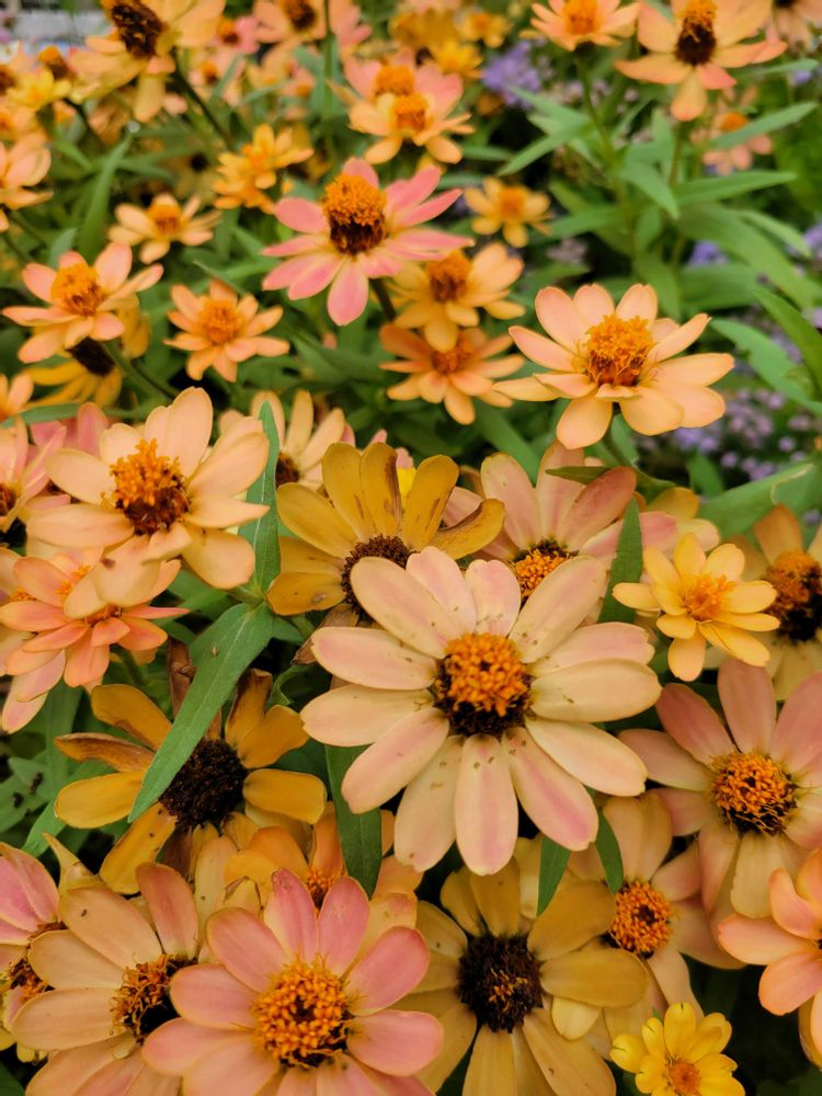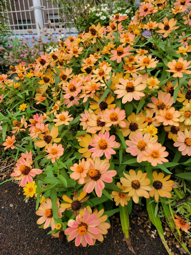 背丈の低い矮性ジニアさんが3色、元気に咲いていました。