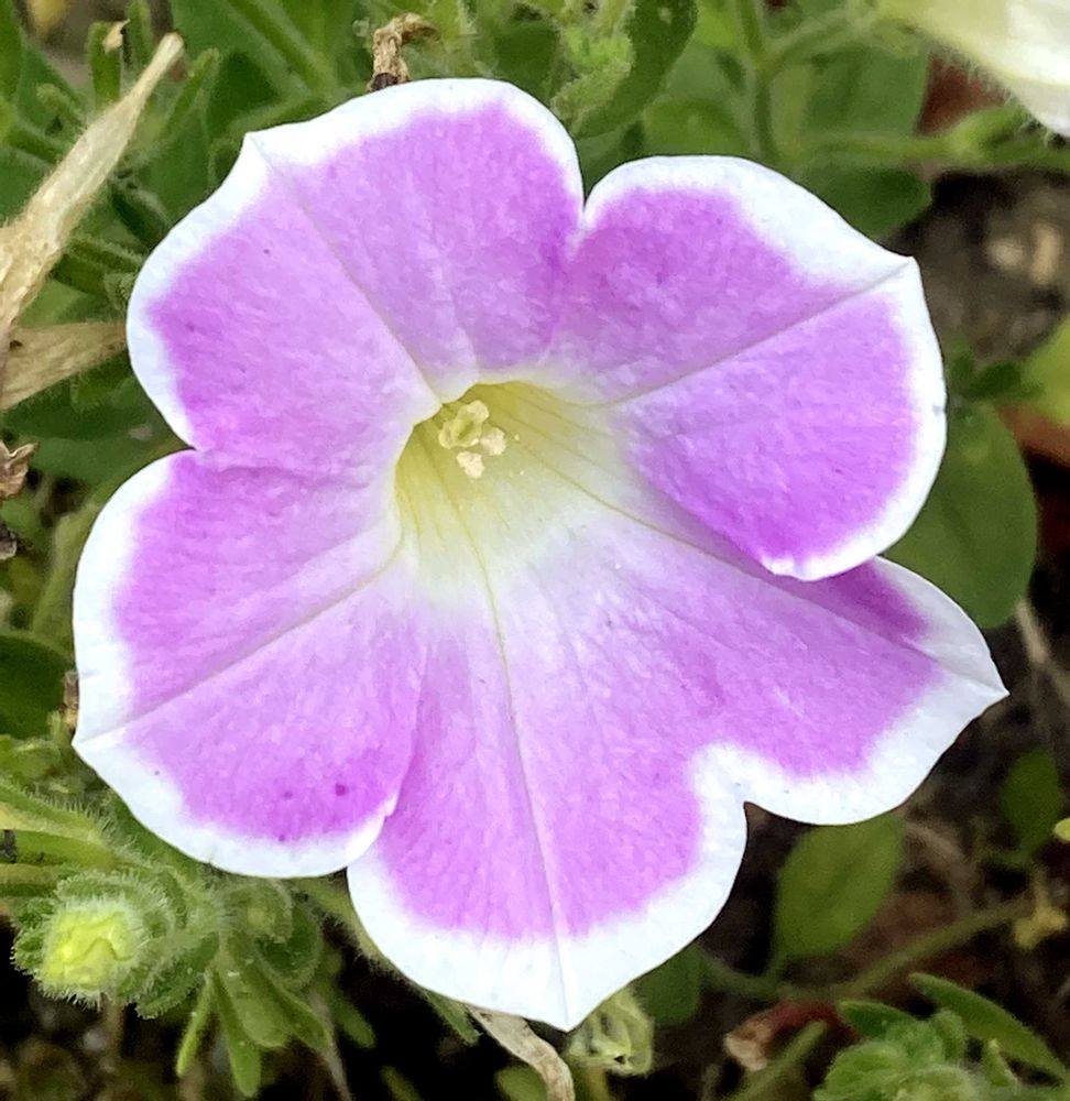 白い縁取りがおしゃれなペチュニアが咲いていました💜