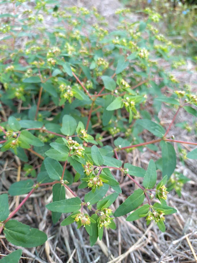 トウダイグサ科ニシキソウ属の一年草。明治時代末の1904年に侵入が確認された北アメリカ原産の帰化植物。各地で野生化し道端などで普通に見られる。茎は淡紅色を帯び、直立または斜上して高さ20〜40㎝になる。葉は対生し長さ1.5〜3.5㎝の長楕円形で、基部は左右が非常に不揃い。花期は6~10月。杯状花序は枝先にまばらにつく。腺体は円形。腺体の付属体はよく発達し、白い花びらのように見える。果実は蒴果。直径約1.7㎜の卵球状で無毛。種子は3個あり黒褐色でゆがんだ卵形。