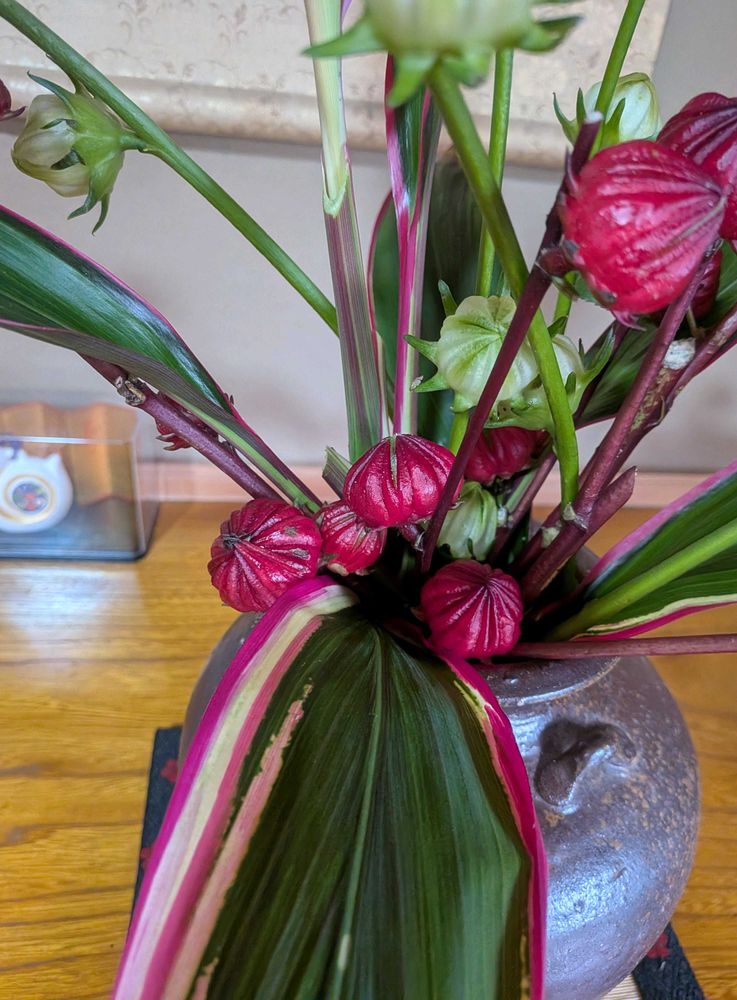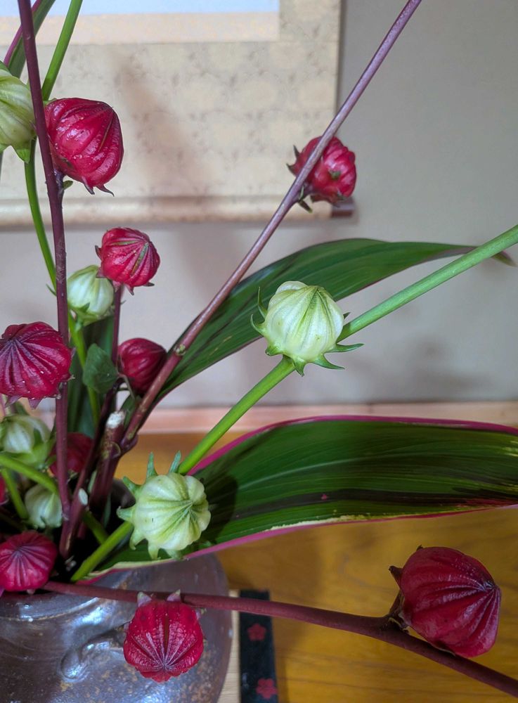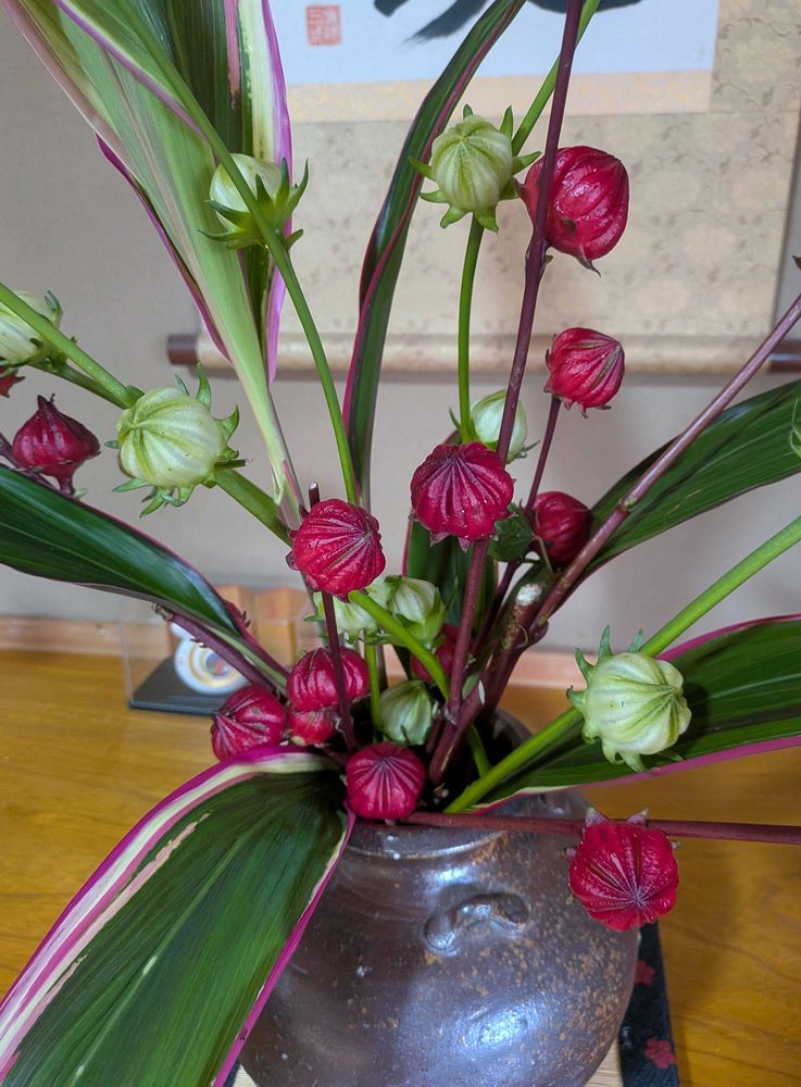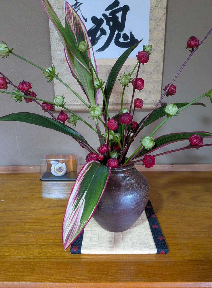 フローラルフォーム(オアシス)を用いれば扱いやすいのですが、立杭焼に生けたかったのでローゼルの自然な枝ぶりを活かすとこうなりました😅😁