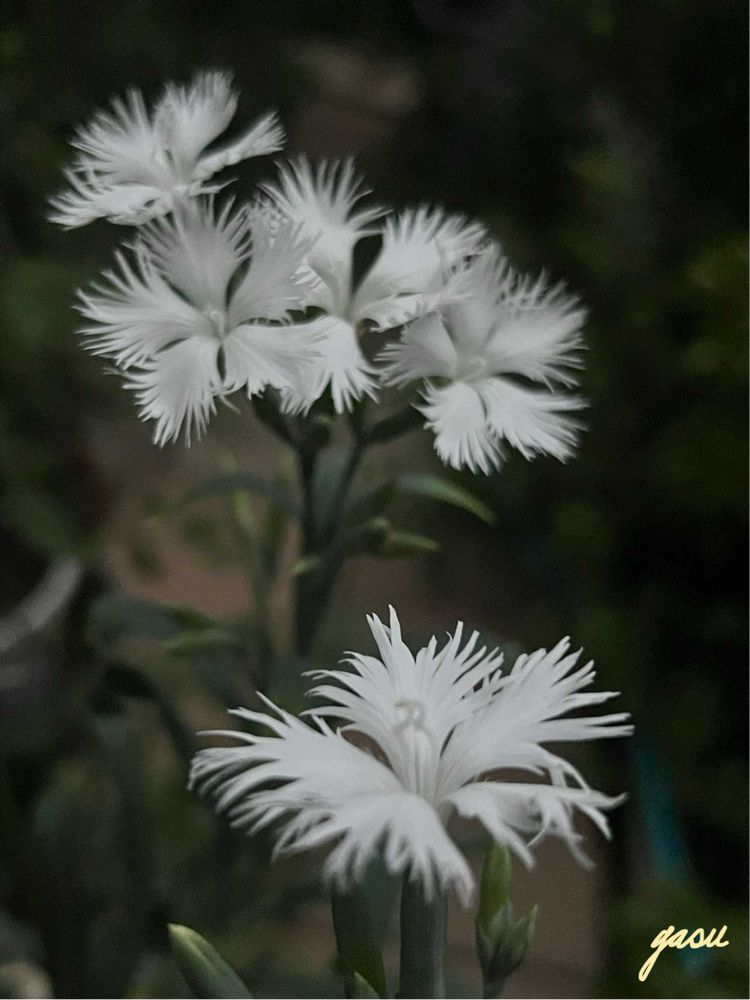 ⑤少し気分良くしてカワラナデシコも撮ってみたら…なんだか幻想的に撮れた⁉️ 暗闇に白が映えてる気がしました🤭