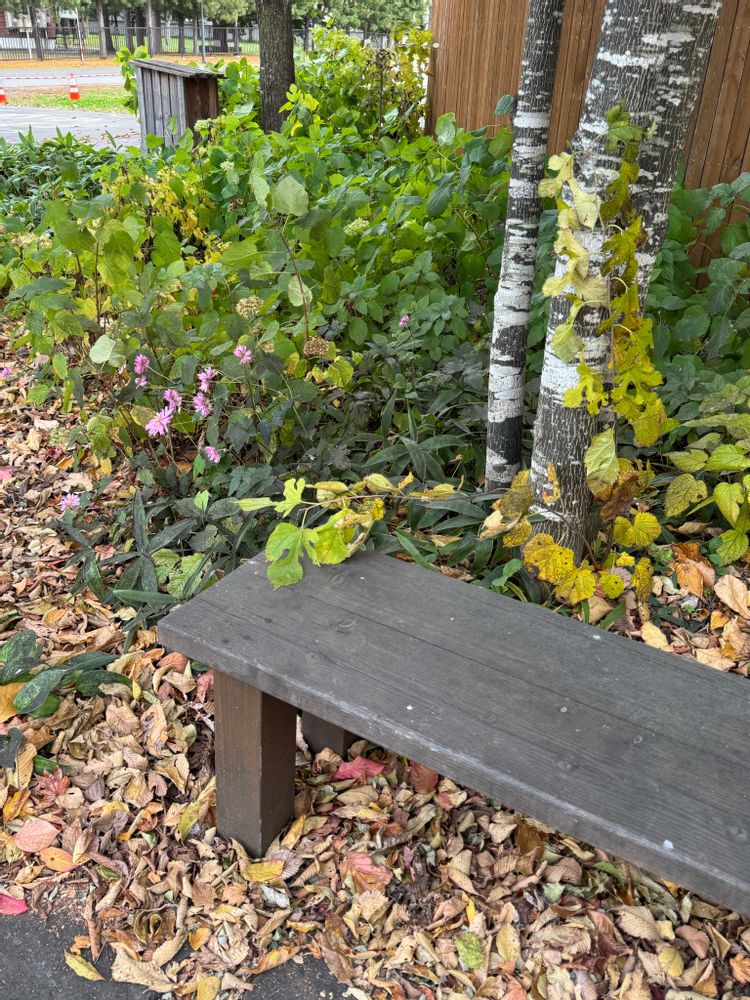 趣のあるベンチ🍁パン屋さんのお庭なのね〜♪秋明菊やガマズミの実が秋らしくて素敵です🍁