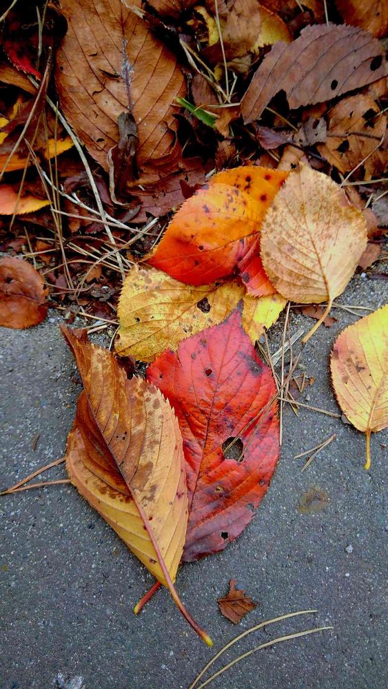 去年の秋頃に写したものです。枯れ葉🍂と落ち葉🍂が綺麗に重なり合っている心がドキドキ💓する程美しい光景だと感じました♡