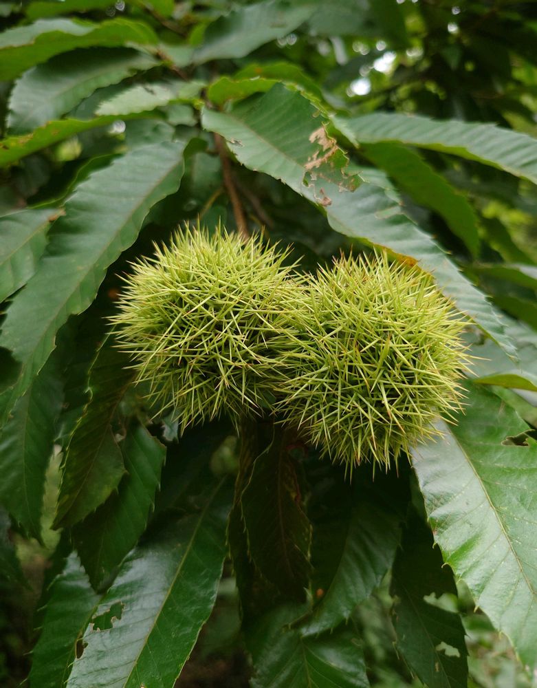 雌花は緑色の総苞の中に3個ずつあり、3mm位の花柱は針状で数個位ずつあり、総苞の外に飛び出します。