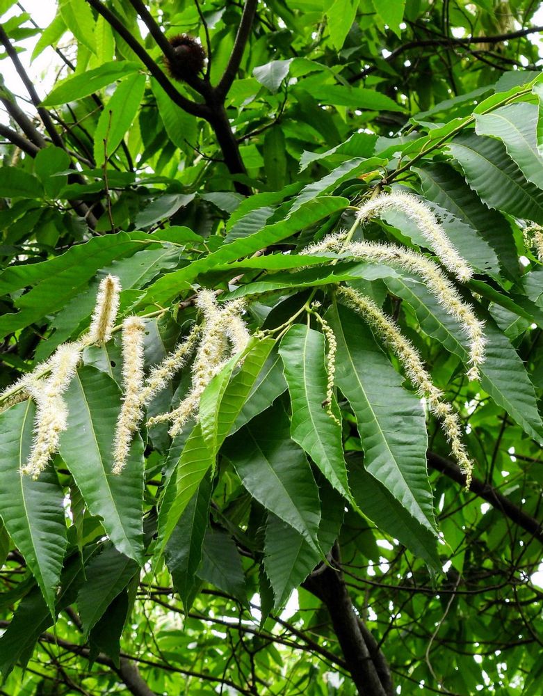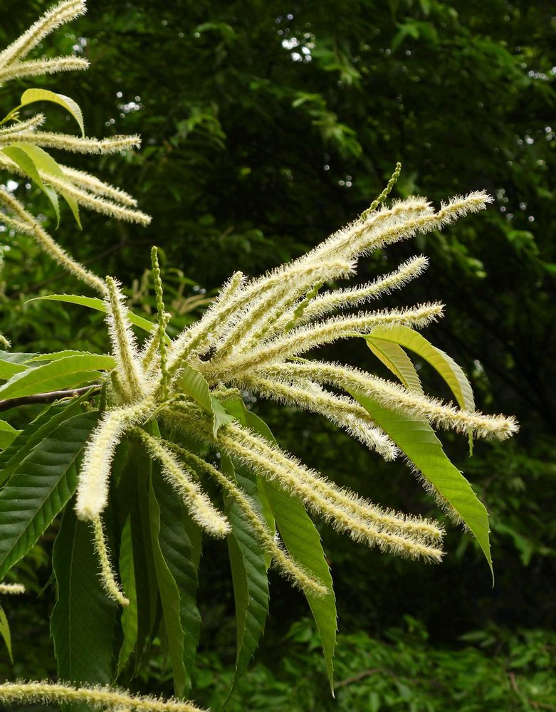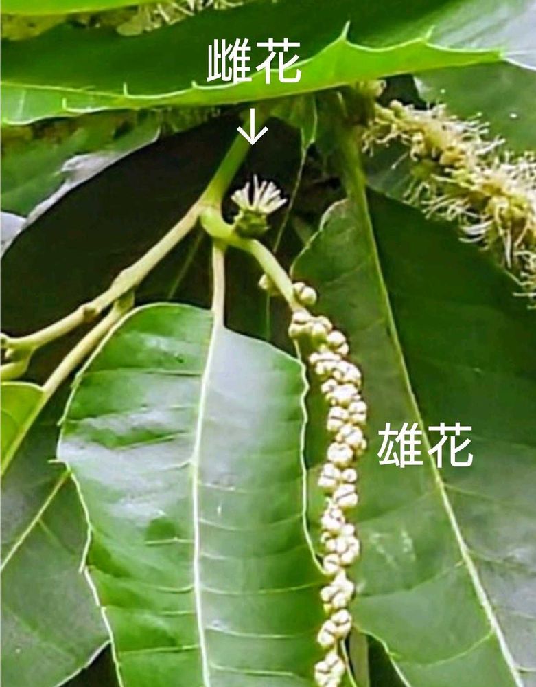 フサフサした花は雄花、基に咲いている小さな白い雌蕊があるのが雌花です。