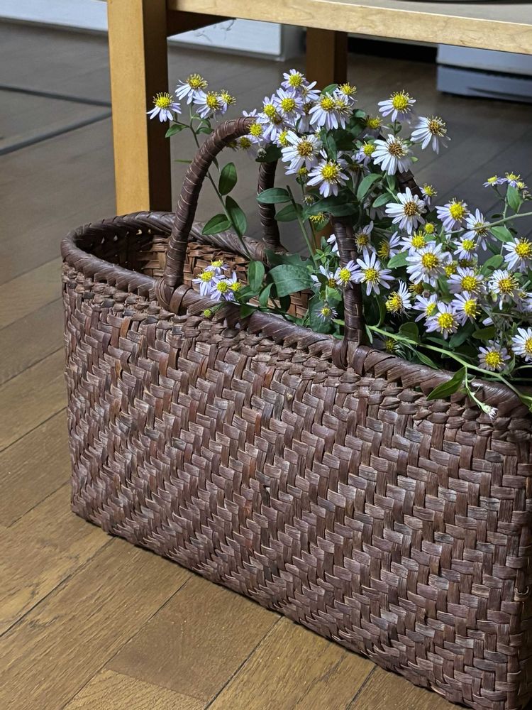 以前見せて頂いた?ヤマブドウの手提げ籠🧺に薄紫色の嫁菜のお花がモダンですね❗