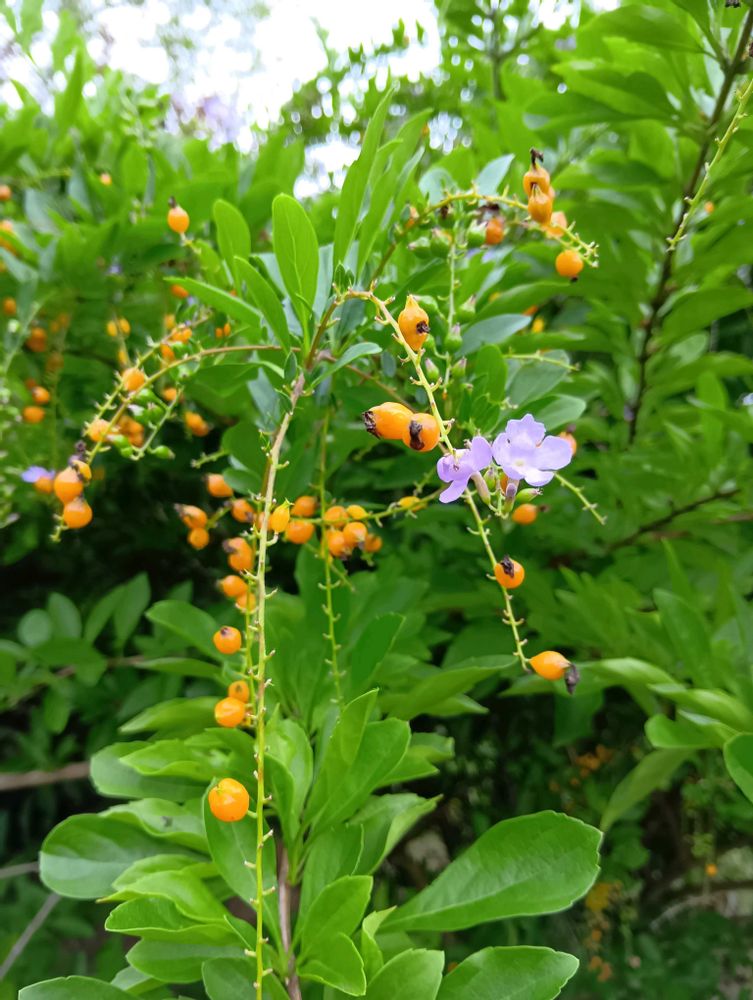 デュランタが薄紫の花から、オレンジ色の実に変わり初めていました💛