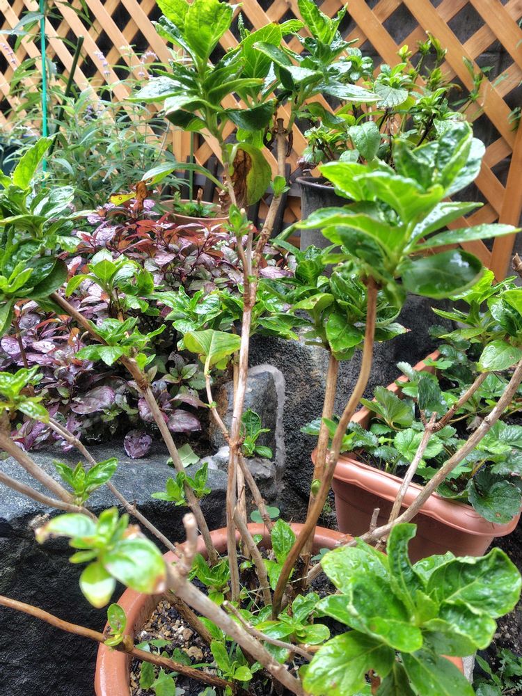 ④紫陽花は…大きな鉢に植え替えようか迷っているうちに、新芽がたくさん出てきた😆。