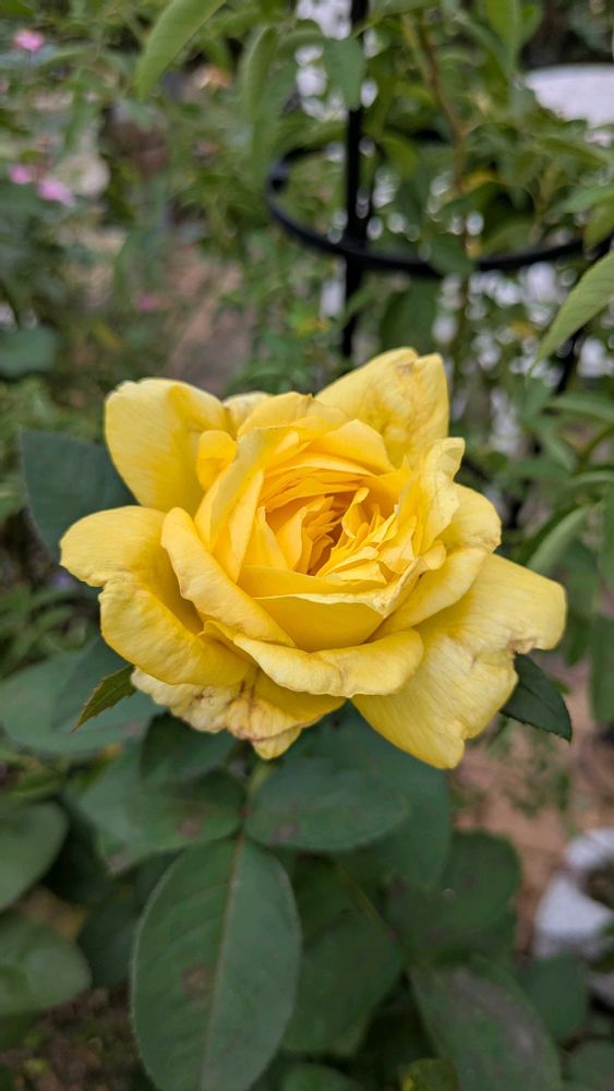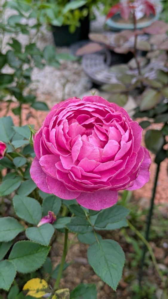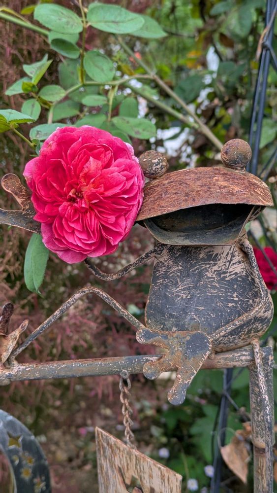 フラマンローズがあらぬところまで伸びて咲いていたので、呼び戻して💦カエルちゃんとパチリ🌹🐸