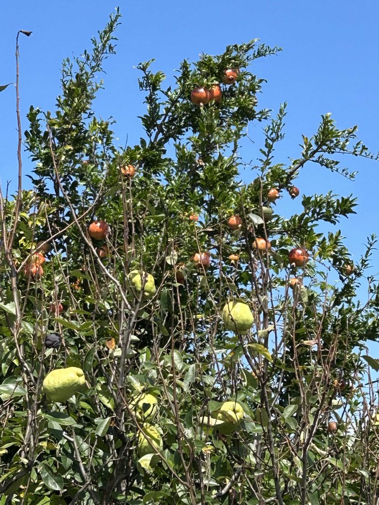 ザクロはもう少しするとパックリ割れて食べ頃です〜カリンはこれからの季節に喉に良いとされていて主にカリン酒にしますが果肉は固くて食べられないです