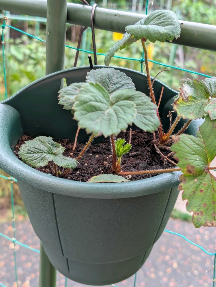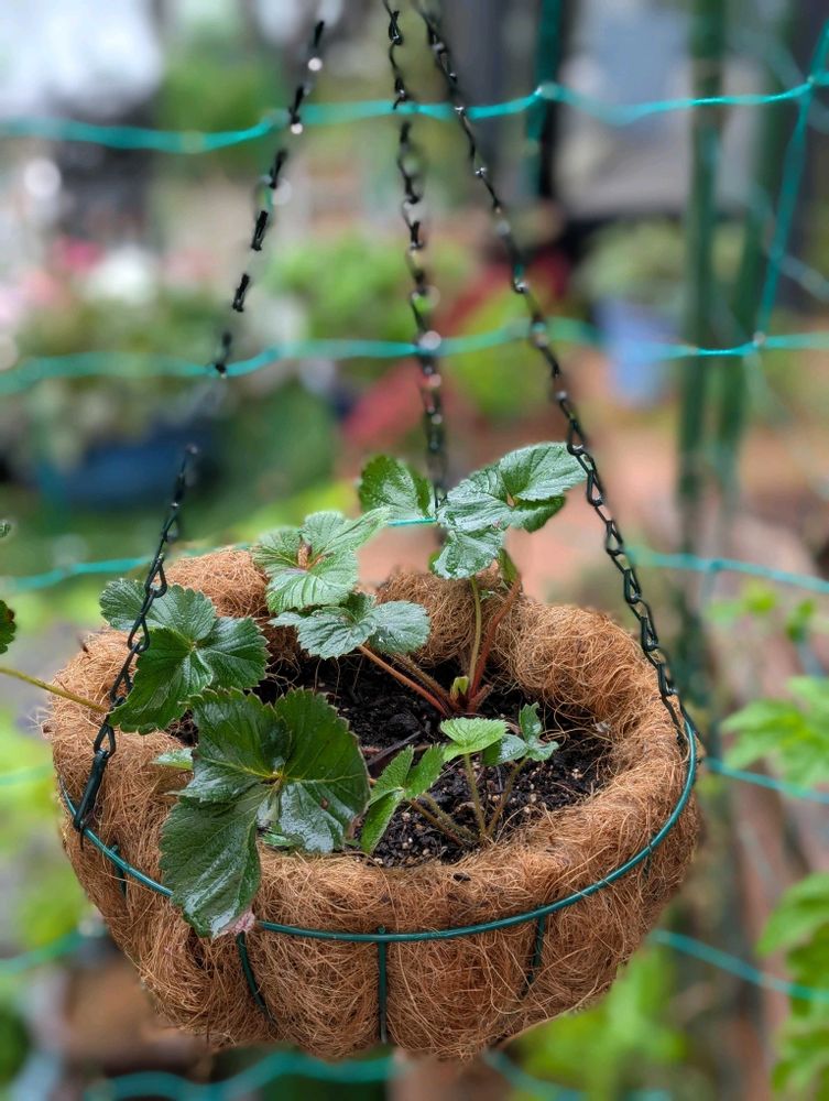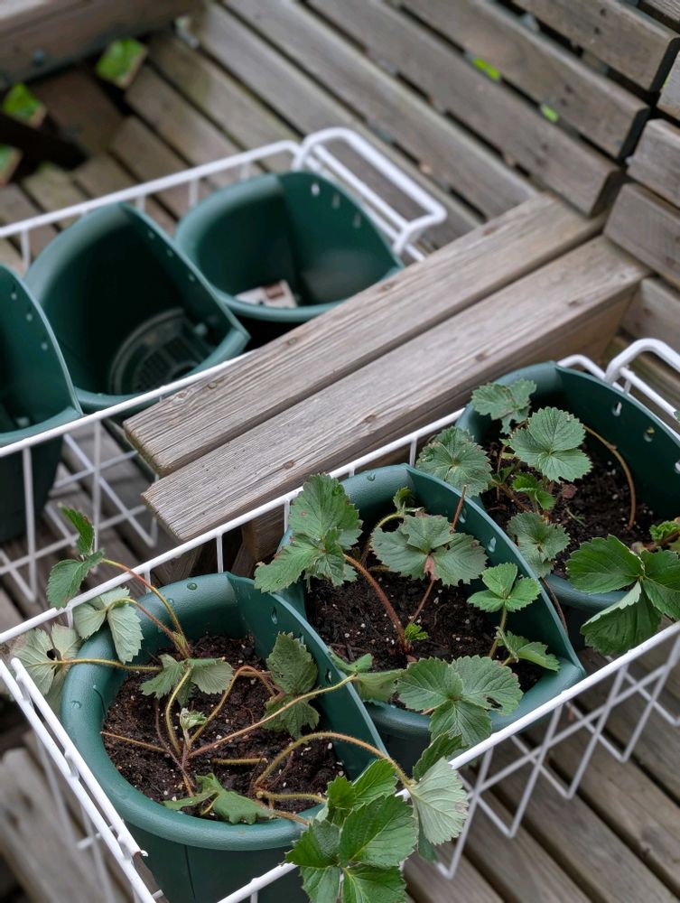 ずっと放置して、広がり過ぎた地植え苺と親苺を整理して今回は壁掛けプランターとハンキングバスケットで栽培初挑戦です🍓🍓
