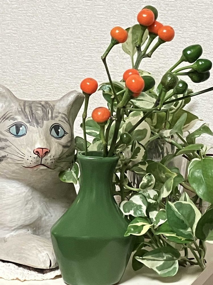 守り猫さん、花瓶、ポトス、唐辛子の色調が同じで素晴らしくマッチ✨✨