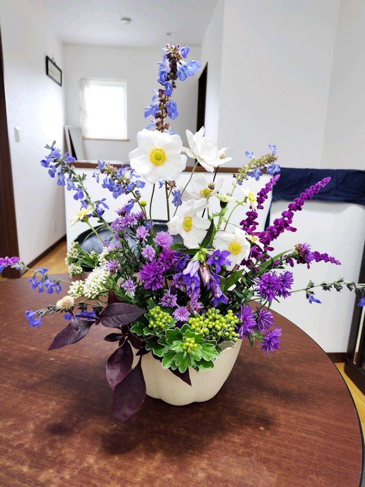 5枚め…フラワーアレンジ、白い秋明菊とブルー💙の花でシックに…💕