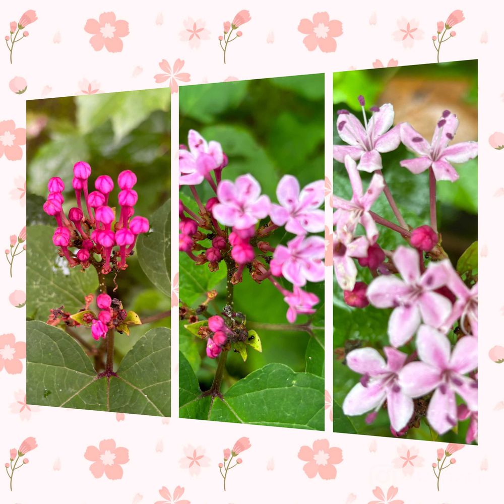 なかなか開かない芙蓉のつぼみと葉っぱの下で、とっとと開花していくボタンクサギ。🌸🩷🌸🩷🌸