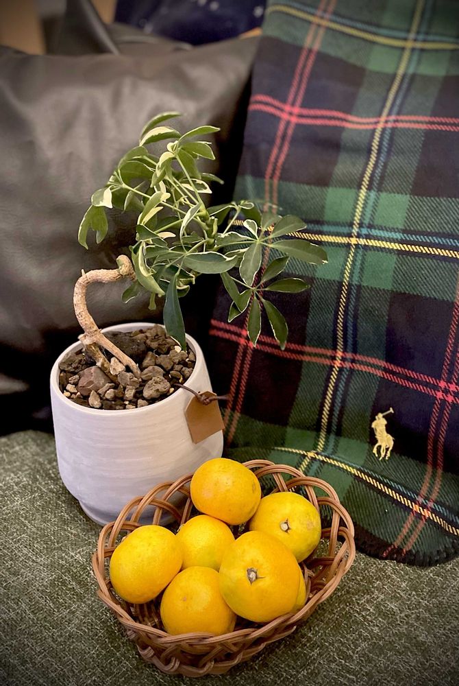 ①小さな斑入りシェフレラを何年か前に買ってきて 曲げが整ってきたので きちんと鉢に植えてあげました。寒いのでひざ掛けも出して。元気出そうって早生みかん食べて。