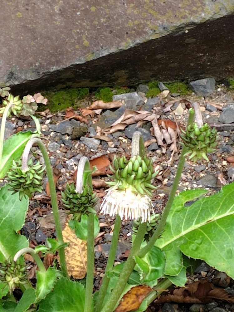 頭花は大型で径10cm程度の白色で、下向きに開花する。
