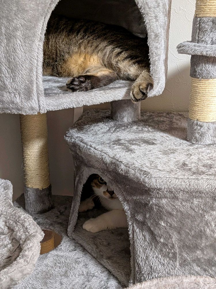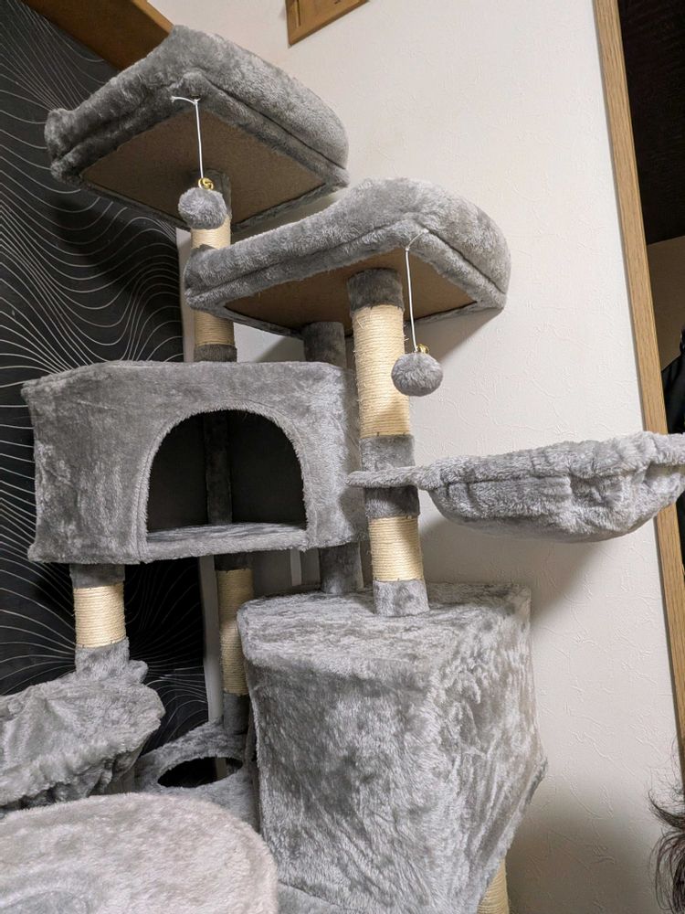 新しいのは組み立ててるときからソワソワして、飛び乗ったりはしないけどそれぞれあちこちでお試しして、自分のお気に入りを見つけてる😅前のは重くて安定感あったけど、これは軽いから鉄アレイ乗せてる。前のは明日ジモティーで売れることになったから、無駄にはならなくて良かった😮💨