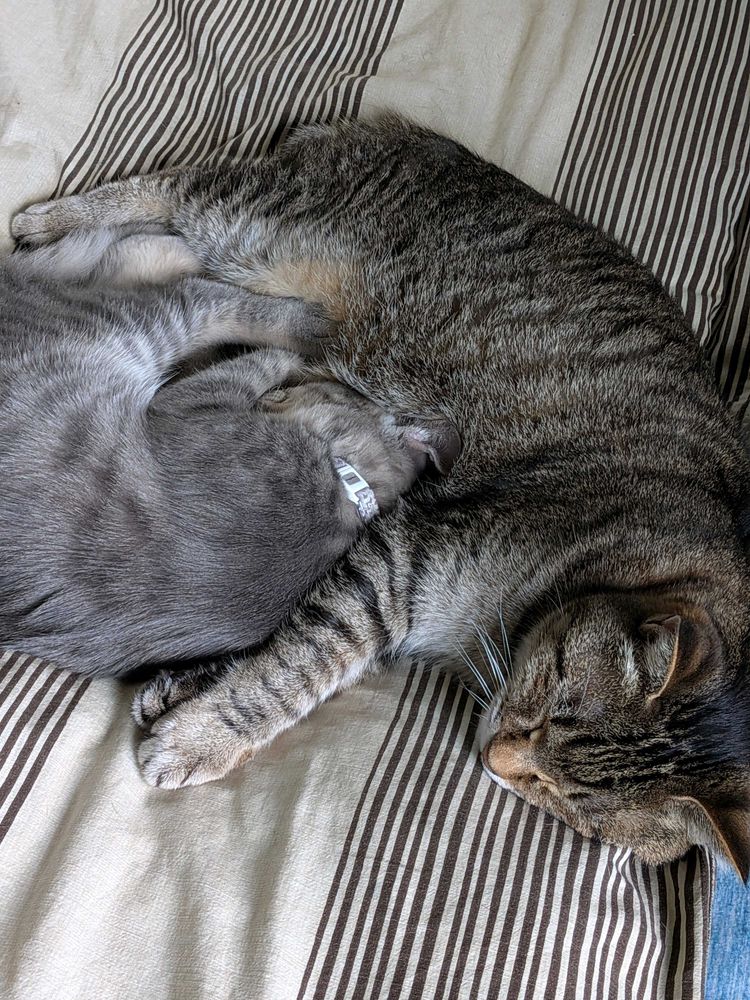 コウちゃんはノアに認められくっついて寝ることも多くなり、ノアが愛おしそうに丁寧にペロペロ。今まで心を許しペロペロしていたのは亡きポンだけ。不思議な、微笑ましいワンシーン😊