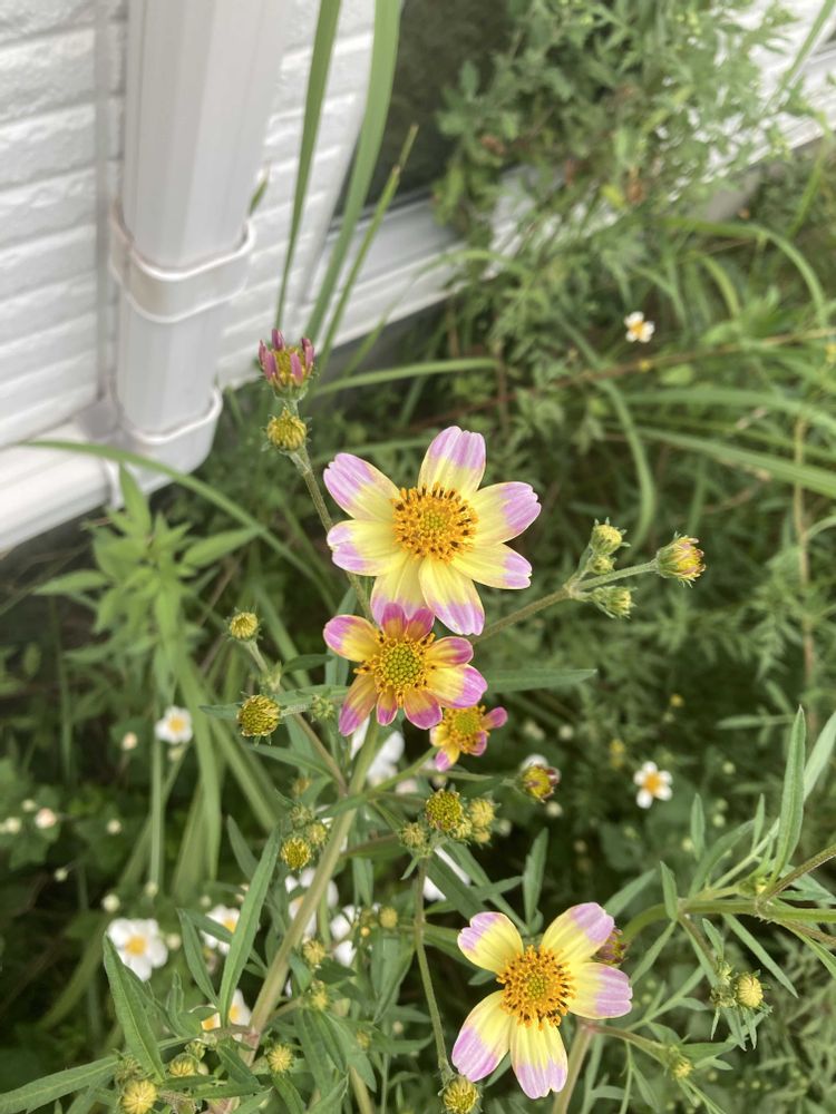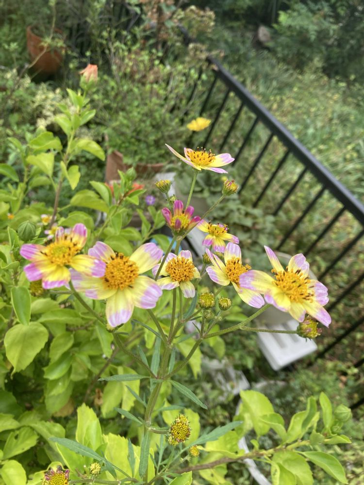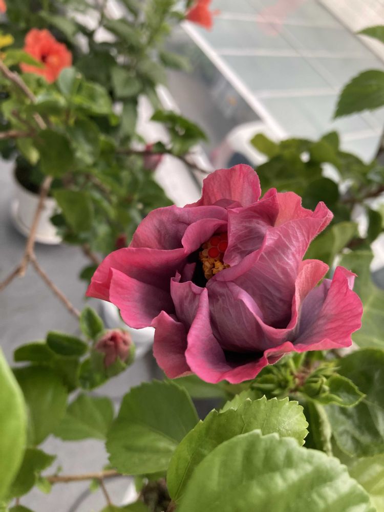 ボサボサのお庭で咲いている ウィターコスモス🌸や千日紅?と 22日ニャンコの日の我が家の🐈⬛と 色が凄く綺麗だなぁ〜と思った 開きそうなハイビスカス🩷