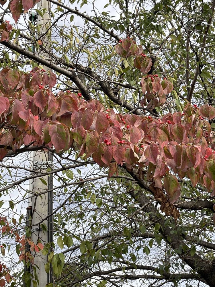 ➊ いつもの川の遊歩道でハナミズキが紅葉🍁していました。