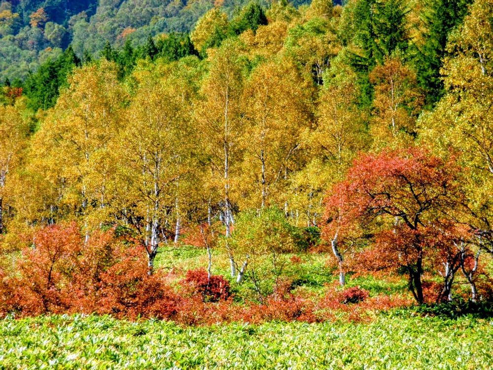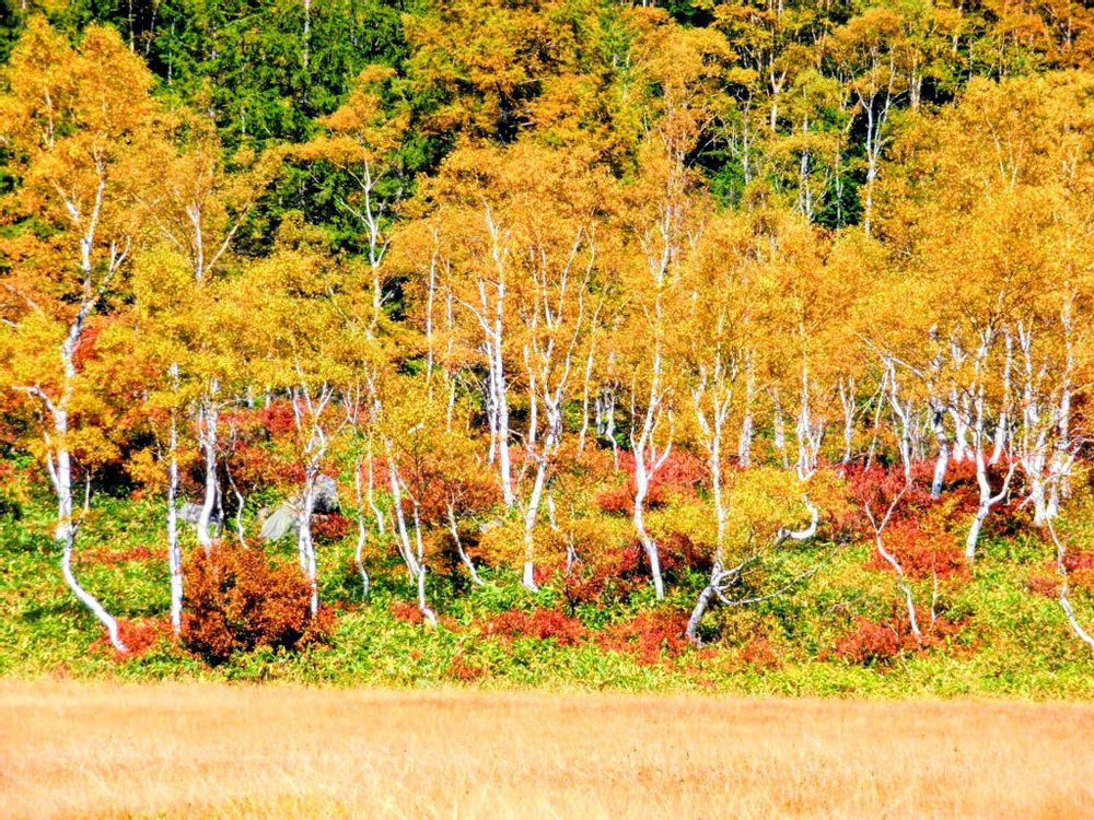草紅葉や白樺紅葉 手前の濃いオレンジ色の紅葉は何かな?