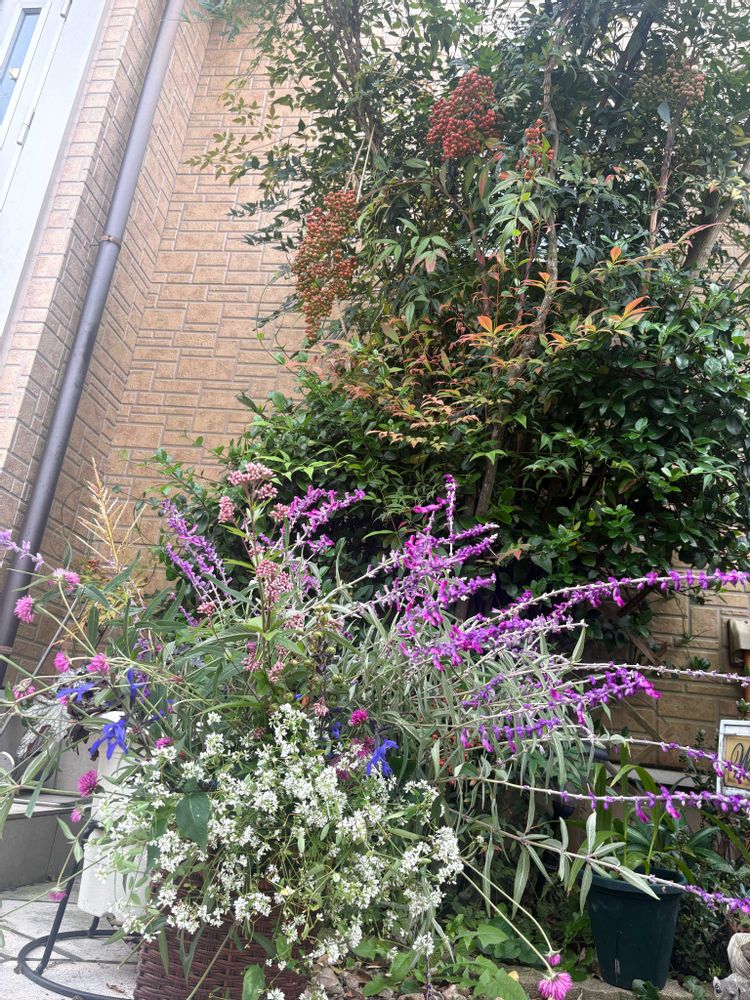 アメジストセージここなら大丈夫だろうと移植したのに、数年経ったらすごい事になって紐でフェンスにくくりつけてるのに、伸びて倒れて来たからバッサリと言っても半分位カット✂️
