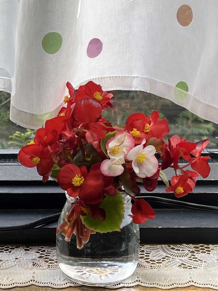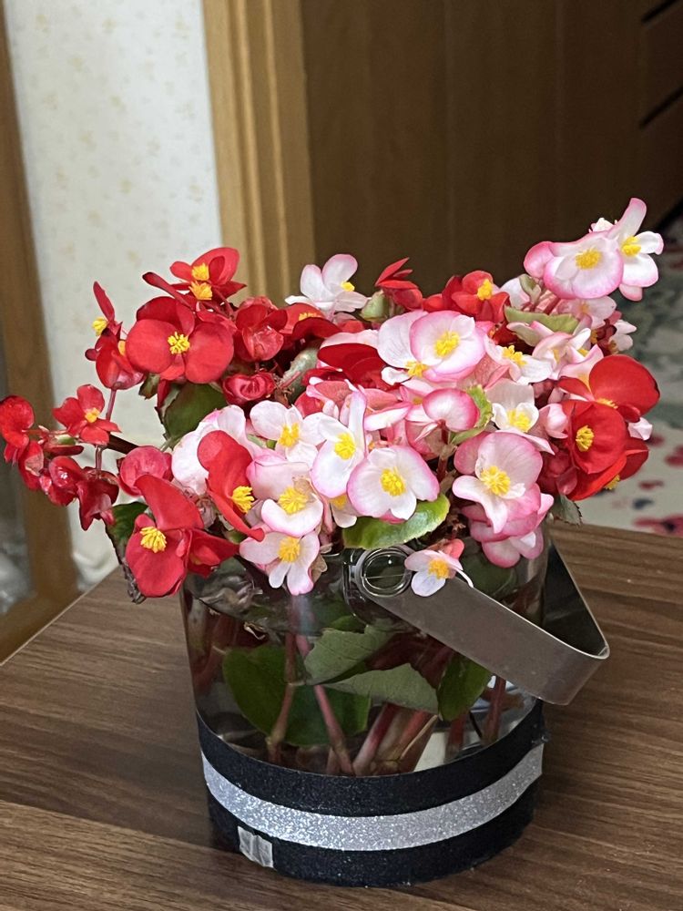 先日鉢上げして部屋に入れたベコニア 冬越しに備えて間伸びした部分をカットして生け花にしました